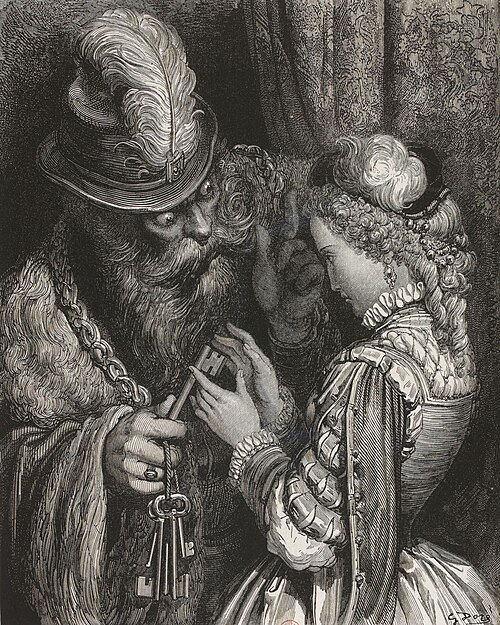 Nàng bị sự tò mò thúc ép đến mức, không kịp nghĩ rằng bỏ khách mà đi là thô lỗ, nàng đi xuống bằng một cầu thang nhỏ bí mật, vội vàng đến mức suýt ngã gãy cổ hai ba lần. Đến cửa căn phòng nhỏ, nàng dừng lại một lúc, nghĩ đến lệnh cấm của chồng và cân nhắc rằng mình có thể gặp chuyện không hay vì đã bất tuân; nhưng cám dỗ quá mạnh đến mức nàng không thể cưỡng lại: nàng cầm lấy chiếc chìa khóa nhỏ và run rẩy mở cửa căn phòng.